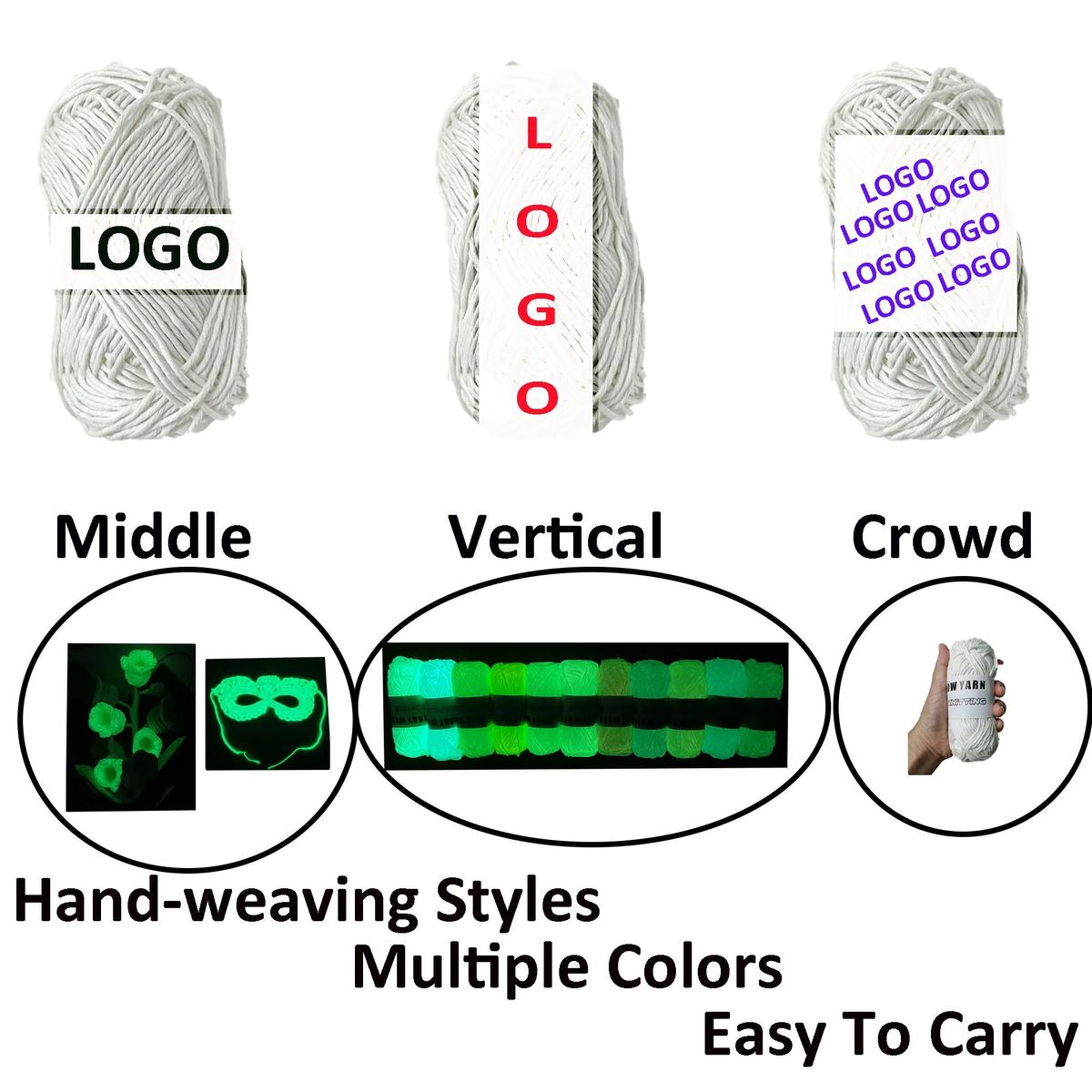 Create unique and enchanting gifts with our Full Color Glow in the Dark Yarn Thread Wool. Made from premium polyester, this luminescent yarn absorbs light during the day and emits a gentle glow at night. With a length of 2050" and a thickness of 0.01", it's perfect for crafting glowing mats, clothes, luminous blankets, and carpets. Customize it with your brand for a special touch. Orders of 5,500 pieces or more qualify for ocean shipping. We guarantee 100% quality satisfaction. Printing area: 1.3" x 2".