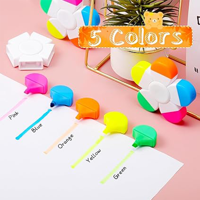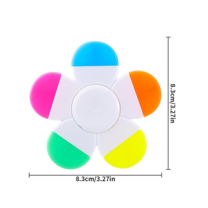 This 5-in-1 petal-shaped highlighter combines fun and functionality. Each pen tip features a different fluorescent color, perfect for school, office, or creative projects. The central spinner disc can be customized with your logo, making it ideal for corporate gifts, promotions, or back-to-school bundles. Compact and colorful (3.27x3.27 inches), these pens engage users while keeping notes vibrant and organized.